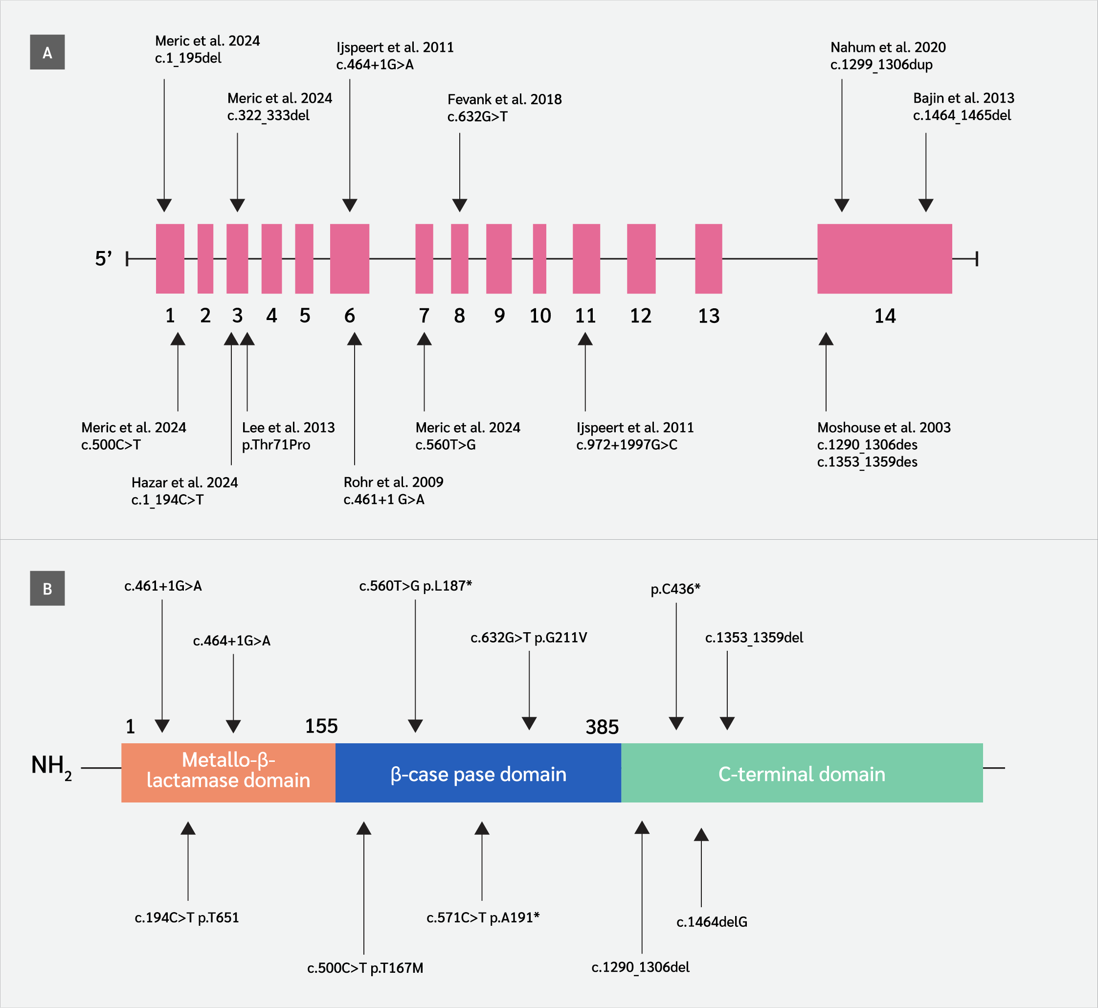 Combined Annotation–Dependent Depletion scores were available for a subset of variants located within the MBL and β-CASP domains. All variants in both domains exceeded the commonly accepted pathogenicity threshold (CADD ≥ 20) (15), indicating a 100% predicted deleterious rate for these domains. No CADD scores were available for variants in the C-terminal domain, primarily due to the presence of large deletions and complex mutations not compatible with current CADD scoring models. According to BayesDel (addAF) scores, 50% of the variants in the MBL domain and 33.3% of those in the β-CASP domain were predicted to be deleterious (threshold> 0.5). Based on Eigen scores, all evaluated variants in the MBL and β-CASP domains exhibited values greater than zero, which is indicative of potential deleteriousness. This corresponds to a 100% predicted pathogenicity rate in both groups. No Eigen scores were available for variants located in the C-terminal domain, primarily due to structural or complex variant types that are beyond the scope of this prediction tool. All evaluated variants within the MBL and β-CASP domains showed DANN scores above 0.9, indicating a predicted deleteriousness rate of 100% in both domains. Variants from the C-terminal domain could not be assessed due to unavailable scores. According to the FATHMM-MKL model, all variants in the MBL domain and 66.7% of those in the β-CASP domain were predicted to be deleterious (threshold >0.5). Using the FATHMM-XF model, deleterious predictions were observed in 50.0% and 66.7% of variants within the MBL and β-CASP domains, respectively. Based on protein stability predictions (ΔΔG ≥1.0), 50.0% of the evaluated variants in the MBL domain were classified as destabilizing, whereas none of the variants in the β-CASP domain met this threshold.