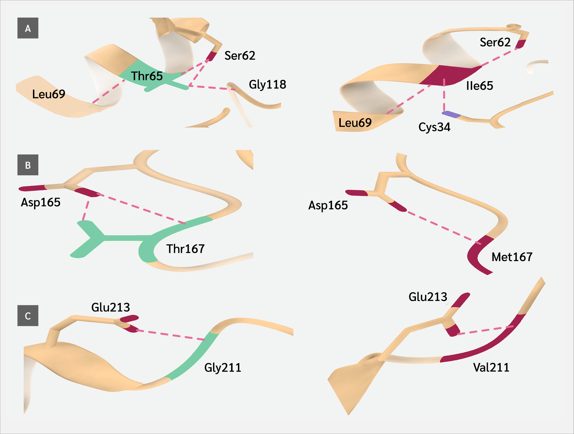 Wild-type and mutant structures were compared using UCSF ChimeraX (version 1.10.1; Resource for Biocomputing, Visualization, and Informatics, University of California, San Francisco, USA) (25). In addition to structural analyses, the evolutionary conservation of the affected residues was evaluated. Homologous protein sequences across multiple species were retrieved from the Ensembl database (release 115; European Bioinformatics Institute, Hinxton, UK), and multiple sequence alignment (MSA) was performed using the ClustalΩ algorithm (version 2024; EMBL–EBI, Hinxton, Cambridge, UK) within the JalView platform (version 2.11.5.0; The Barton Group, University of Dundee, UK) (26). Conservation scores were analyzed to determine whether the substituted residues are located within highly conserved regions, as alterations in such positions are more likely to be functionally deleterious.