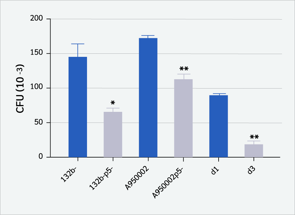 As shown in Figure 2, the presence of P5 protein in P5+ strains (132b-, A950002, and d1) increased the binding to CD4+ T cells significantly compared to P5-deficient strains (132b-p5-, A950002p5-, and d3), with p value less than 0.05 [132b- vs. 132b-p5- (p=0.0009), A950002 vs. A950002p5- (p=0.0039), d1 vs. d3 (p=0.0014)]. However, P5-deficient strains can still bind to T cells. These findings suggest that the P5 protein contributes to H. influenzae binding to T cells in a significant but non-essential way.