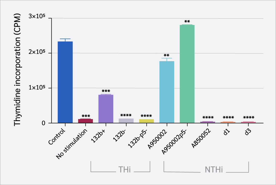 CD4+ T cells were isolated from healthy individuals and infected with live variants of a single strain of THi (132b+, 132b-, 132b-p5-) and NTHi (A950002, A950002p5-, A850052, d1, d3). The CD4+ T cell responses to H. influenzae were investigated in vitro by evaluating the cell proliferation using a [³H]-thymidine incorporation assay and measuring the levels of T helper-1 (Th1) cytokines (interferon-gamma [IFN-γ], tumor necrosis factor-alpha [TNF-α]) and Th2 cytokines (interleukin-5 [IL-5], interleukin-10 [IL-10]) using a human Th1/Th2 cytokine cytometric bead array (CBA).