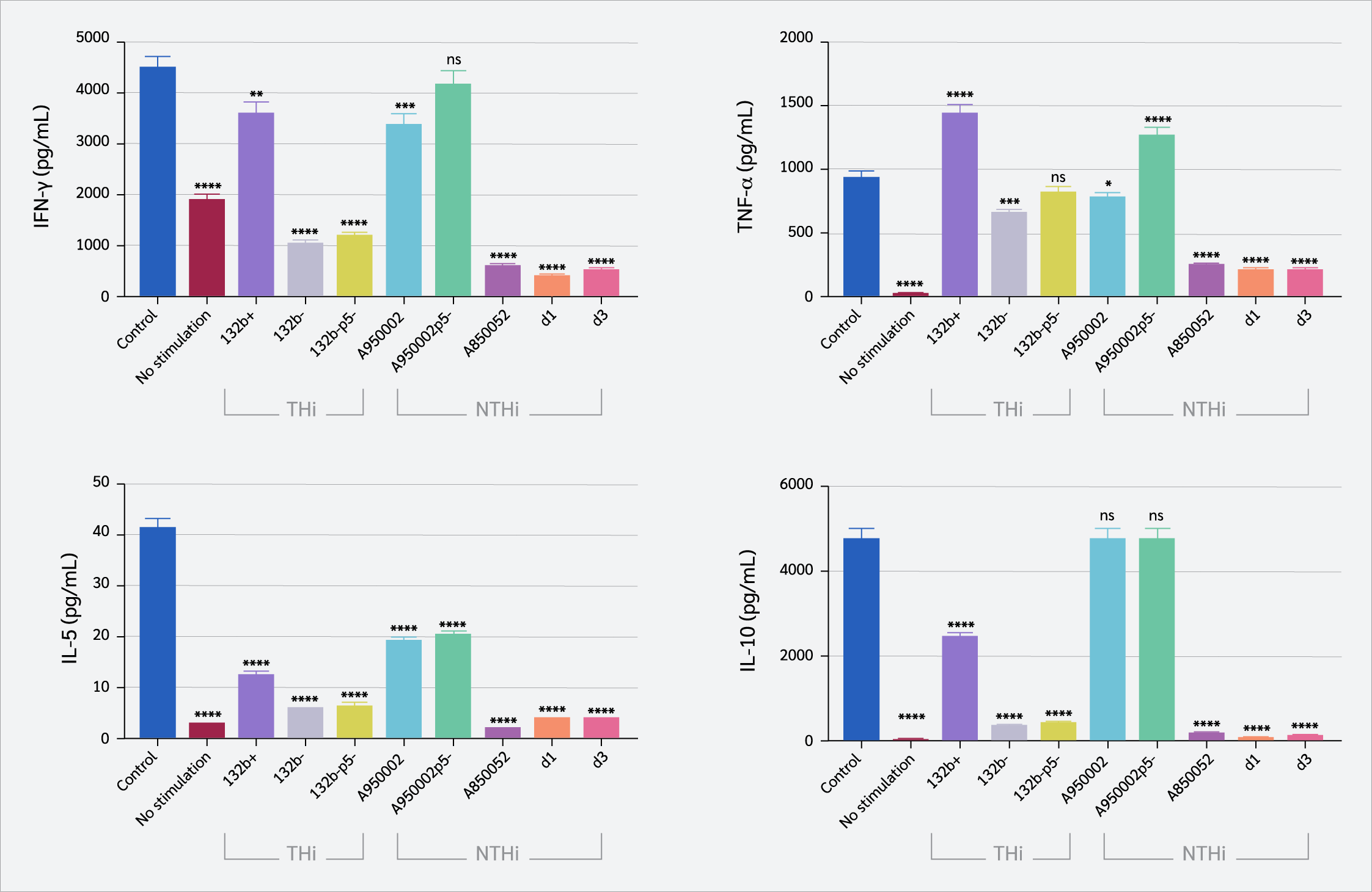 The production of Th1 (IFN-γ and TNF-α) and Th2 (IL-5, and IL-10) cytokines by CD4+ T cells were assessed using a cytometric bead array to assess Th1 and Th2 immunological responses to H. influenzae infection (Figure 4). IFN-γ production was significantly inhibited by both THi and NTHi strains (except A950002p5- strain), with marked suppression observed for NTHi strains (A850052, d1, d3) and the THi strains 132b- and 132b-p5- (p<0.0001). TNF-α production was significantly inhibited by132b- strain (p=0.0002), A950002 strain (p=0.01), A850052, d1and d3 strains (p<0.0001). In contrast, THi strain 132b+ and NTHi strain A950002p5 significantly increased TNF-α production (p<0.0001). IL-5 production was reduced by all THi and NTHi strains (p<0.0001), while all THi and NTHi (A850052, d1, d3) decreased IL-10 production (p<0.0001).