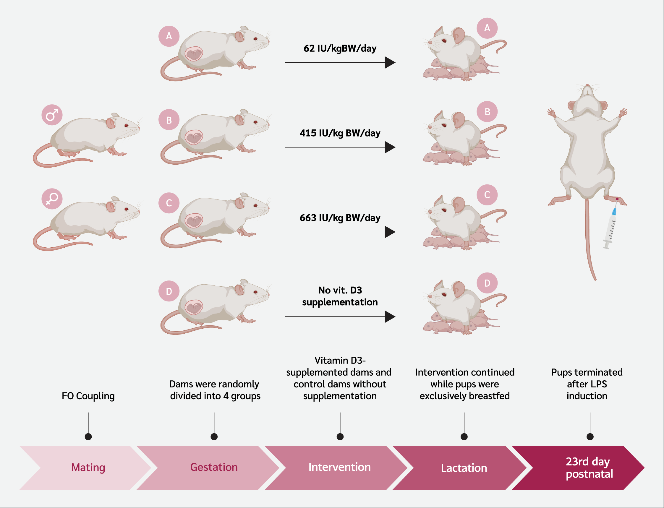 No preclinical study has simultaneously implemented prenatal (gestational & lactational) vitamin D₃ supplementation, followed by acute lipopolysaccharide (LPS)-induced inflammation in offspring, with serum measurement of IL-6 and IL-1β at the 3-hour post-injection timepoint. Prior studies have focused on single markers (e.g., tumor necrosis factor alpha [TNF-α] without LPS challenge), organ-specific inflammation, or descriptive immune modulation without acute challenge. Our design fills this critical knowledge gap by targeting downstream cytokine responses in a time-sensitive, systemic inflammatory context.