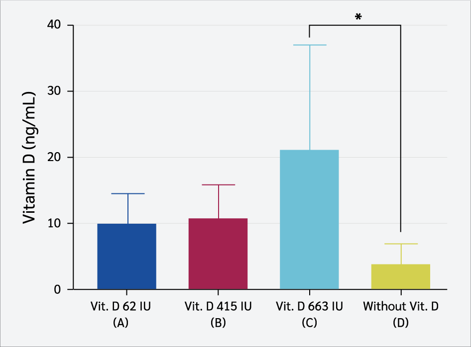 Serum vitamin D₃ levels (ng/mL) in the four groups were assessed on day 23 after LPS induction. This study showed a significant difference in the mean levels (Figure 3) between the group of rats receiving 663 IU/kg BW of vitamin D₃ (21.15 ± 15.8 ng/mL) and the group that did not receive vitamin D₃ (3.56 ± 3.20 ng/mL) (one-way ANOVA, post hoc LSD, p=0.023).