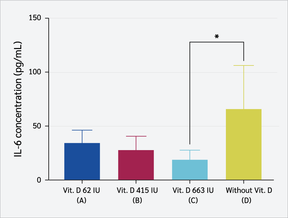 In addition to IL-1β, maternal vitamin D₃ supplementation also reduced serum IL-6 concentrations in offspring. The lowest IL-6 level was observed in the 663 IU/kg group, which was significantly different from the non-supplemented group. IL-6 is a pleiotropic cytokine secreted by macrophages, dendritic cells, T lymphocytes, and fibroblasts in response to infection or tissue injury (49). It regulates immune cell activation, antibody production, and acute-phase responses, and persistent elevation is linked to chronic inflammatory conditions such as type 2 diabetes, autoimmune diseases, and atherosclerosis (37,40,41). Lipopolysaccharide, the main component of Gram negative bacterial cell walls, stimulates IL-6 production by binding TLR4 and activating NF-κB signaling, which also drives the release of IL-1β and TNF-α (38-41). By suppressing NF-κB activation and preventing its nuclear translocation, vitamin D₃ downregulates IL-6 expression (39,49). Vitamin D₃ also reprograms macrophages from a pro-inflammatory M1 state to an anti-inflammatory M2 state, reduces IL-6 while increasing IL-10 secretion, and inhibits Th17 cells that normally amplify IL-6 production, while supporting regulatory T cells that maintain immune tolerance (23, 50-52). These findings are in line with research by Gatera et al. (52), which reported that vitamin D₃ reduces LPS-induced IL-6 synthesis by interfering with NF-κB signaling. Collectively, these mechanisms demonstrate the capacity of vitamin D₃ to modulate LPS-triggered inflammation through coordinated suppression of both IL-1β and IL-6.