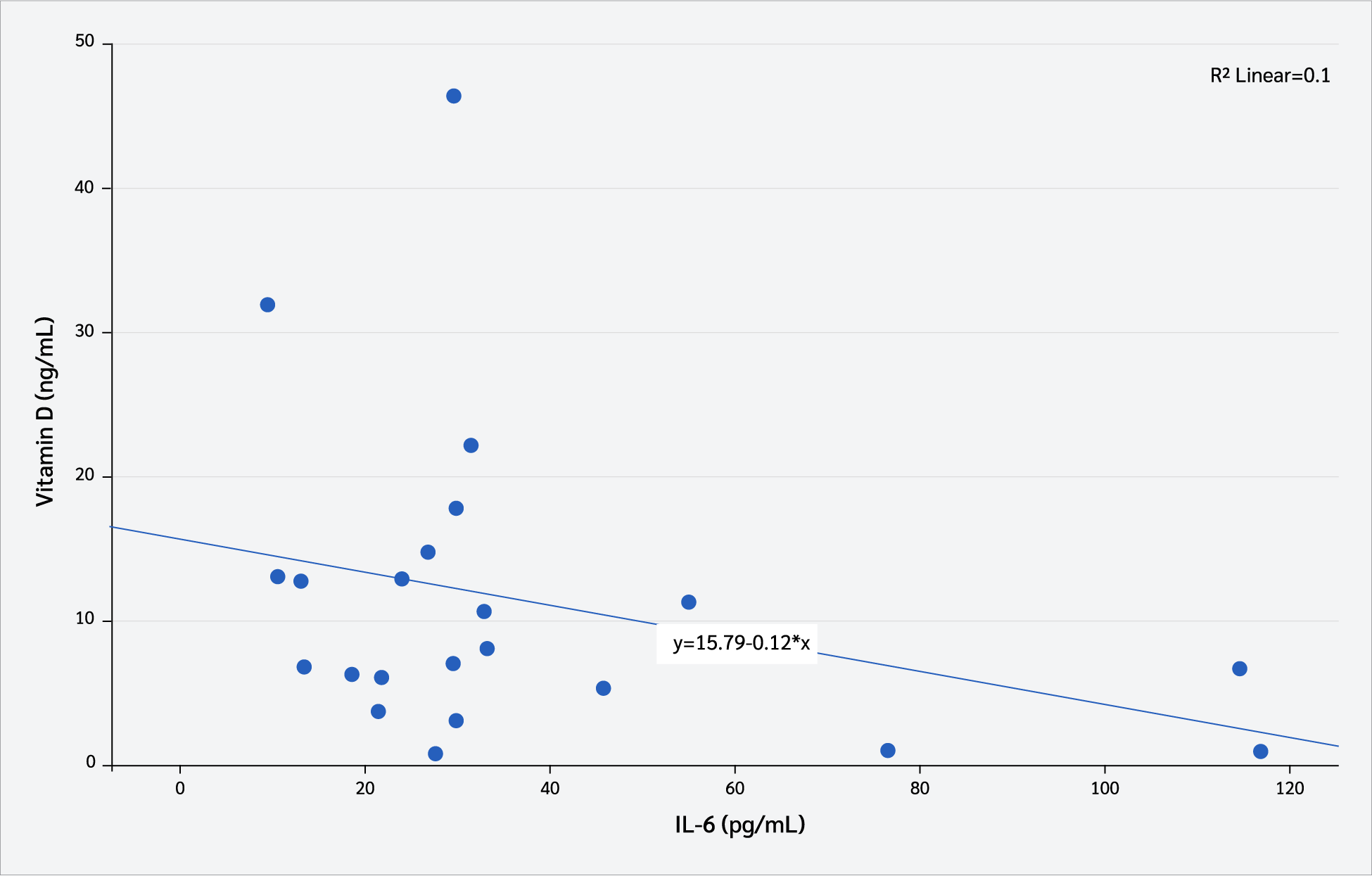 Correlation analyses were conducted to examine the relationship between serum vitamin D₃ levels (pg/mL) and interleukin levels. As shown in Figure 6, serum vitamin D₃ levels exhibited a moderate negative correlation with serum IL-1β concentrations (Pearson’s correlation, r=-0.43, p=0.042). In contrast, no statistically significant correlation was observed between serum vitamin D₃ levels (pg/mL) and serum IL-6 concentrations (Pearson’s correlation, r=-0.031, p=0.153) (Figure 7).